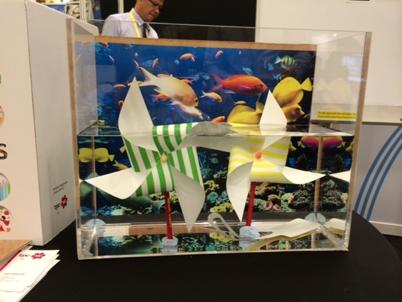 Un test parle plus que des milliers de mots : Présentation de Robuskin dans un aquarium rempli d'Elof Hansson lors du DocuWorld 2014 à Singapour.